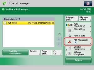 Il est possible de convertir des images en niveaux de gris/couleur d'origine lues à une résolution de 300 ppp en fichiers PDF ou XPS compacts (à une échelle d'environ 1/10 de la taille d'origine). Ce mode élimine le problème touchant la taille importante de fichier de documents numérisés, réduisant les documents couleur à la taille de documents monochromes. Il permet aussi de réduire la charge sur le réseau et les serveurs. Pour plus d'informations, voir