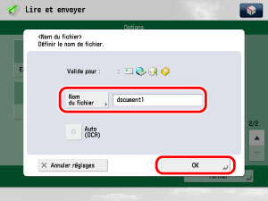 Si le format de fichier [OCR (rech. texte poss.)] pour [PDF], [XPS] ou [OOXML] est sélectionné, régler [Auto (OCR)] sur "Oui" pour extraire automatiquement la première chaîne de texte du document détecté et l'utiliser comme nom de document.