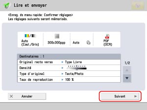 Pour plus d'informations sur la boîte de dialogue de confirmation des réglages, voir "Envoi d'un document avec le menu rapide".