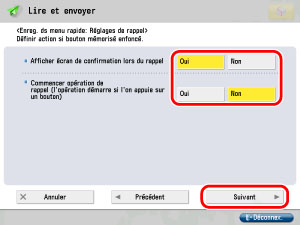 Si [Non] est sélectionné, il faut appuyer sur le bouton mémorisé puis appuyer sur  pour démarrer le traitement des réglages mémorisés.