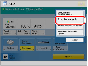 En cas de mémorisation des réglages des fonctions fréquemment utilisées telles que Copie, Lire et envoyer et Lire et mémoriser dans le Menu rapide, il est possible d'utiliser ces réglages sur une autre machine.