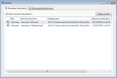 Cliquez sur l'icône de notification de nouveau document [Journal] dans la fenêtre de notification de nouveau document pour faire apparaître la fenêtre [Journal]. Dans la boîte de dialogue [Journal], double-cliquez sur un élément de la liste de nouveaux documents pour démarrer le Desktop Browser et afficher les éléments du dossier contenant de nouveaux documents dans le Volet de liste de fichiers.