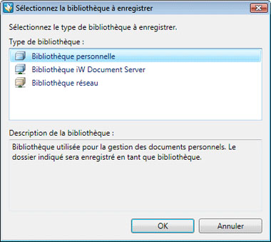 L'iW Desktop enregistre les dossiers et les documents dans des bibliothèques. Deux types de bibliothèque sont utilisés ; les bibliothèques personnelles et les bibliothèques partagées (les bibliothèques situées sur le Document Server). Une bibliothèque personnelle peut être créée en spécifiant un dossier sur un ordinateur du réseau, en plus d'un dossier sur un ordinateur local.