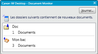 Vous pouvez utiliser Document Monitor pour surveiller le contenu des dossiers de l'Espace avancé. Configurez les dossiers à surveiller avec l' iW Desktop et autorisez la notification pour la présence de nouveaux documents, et une icône et une fenêtre de notification de nouveau document apparaîtront lorsqu'un document sera enregistré dans un dossier de l'Espace avancé.