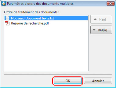 pour afficher la boîte de dialogue [Paramètres d'ordre des documents multiples]. Dans la boîte de dialogue [Paramètres d'ordre des documents multiples], définissez l'ordre dans lequel assembler les documents dans le document Reliure unique.