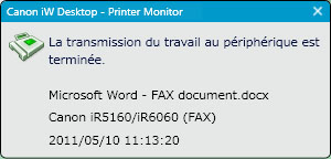 Ce message s’affiche pendant la période allant du début de la mise en file d’attente effectuée par le spouler de Windows, jusqu’à la fin d’une tâche d’émission de télécopie à l'imageRUNNER ADVANCE.