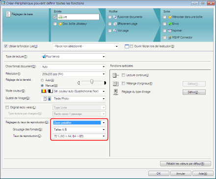 Sélectionner [Zoom prédéfini] pour les [Réglages de taux de reproduction] → sélectionner [Pouces] sous [Groupage des formats] → sélectionner [70 % (A3 -> A4, B4 -> B5)] sous [Taux de reproduction].