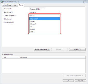 Pour [Chemin du fichier], saisir "\sales\%" → sélectionner [%loginname%] dans la liste qui s'affiche en saisissant "%".