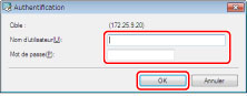 Si la boîte de dialogue [Authentification] s'affiche, saisir l'ID de l'administrateur système dans le champ [Nom d'utilisateur] → saisir le code PIN système dans le champ [Mot de passe] → cliquer sur [OK].