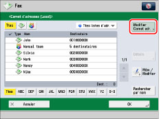 [Modifier Carnet adr.] s'affiche uniquement lorsque le carnet d'adresses distant et le serveur LDAP sont enregistrés. Si seul le serveur LDAP est enregistré sur la machine, la mention [Vers Serv. LDAP] s'affiche.