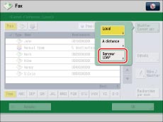Il n'est pas possible de spécifier directement un destinataire obtenu par le biais d'un serveur en tant que destination de transfert. Pour spécifier un destinataire comme destination de transfert, il faut d'abord l'enregistrer dans le carnet d'adresses local. (Voir "Mémorisation d'une adresse obtenue par le biais d'un serveur LDAP".)