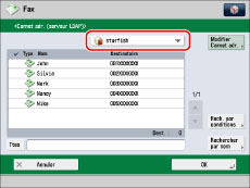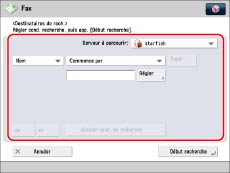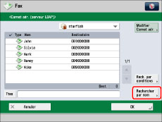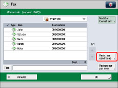 Si le résultat de recherche de [Rech. par conditions] s'affiche à l'écran de la liste des destinataires, il est impossible d'appuyer sur [Rechercher par nom] pour affiner la recherche par nom.