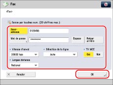 Appuyer sur [Régler les détails] pour définir la sous-adresse, le mot de passe, le réglage TX MCE, la vitesse d'envoi et le réglage Longue distance. Si la machine est réglée pour utiliser plusieurs lignes, il est également possible de sélectionner la ligne à utiliser lors de l'envoi.