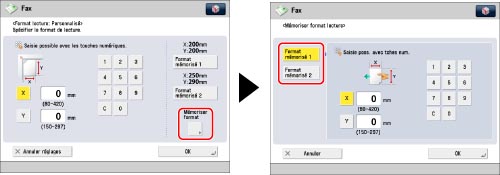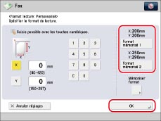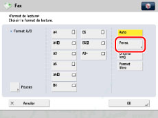 En cas d'envoi d'une télécopie en mode Envoi direct ou Envoi manuel et si l'original est placé dans le chargeur, le réglage Format de lecture spécifié n'est pas utilisé.