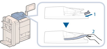 A la lecture d'originaux longs du chargeur, le réceptacle de sortie des originaux auxiliaire doit être sorti pour éviter de froisser les originaux lus. Dans ce cas, soutenir les originaux sortis avec les mains.