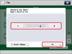 Si la densité de fond est réglée en appuyant sur [Régler] for <Densité du fond>, le réglage [Auto] est annulé. De même, si l'on appuie sur [Auto] pendant la configuration manuelle sous [Régler], les réglages sont annulés. La machine règle automatiquement la densité en fonction du fond.