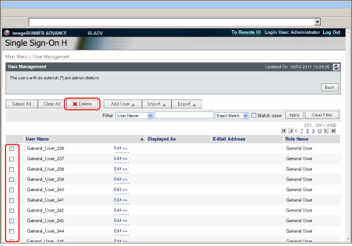 Cliquer sur [User Name], [Department ID] (si la [Gestion des numéros de service] est activée), sur [Displayed As], [Select Role to Set] ou [E-Mail Address] sur la page [User Management] pour modifier l'ordre de tri des données utilisateur enregistrées.