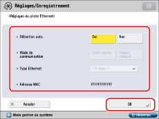 Si l'on rebranche le câble réseau (par exemple, sur un concentrateur Ethernet différent) alors que l'interrupteur principal de la machine est sur Marche, la fonction de détection automatique ne fonctionnera pas, même si <Détection auto.> est réglé sur "Oui". (Mettre l'interrupteur principal de la machine sur Arrêt avant de brancher le câble.)