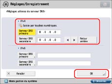 Appuyer sur [Réglages nom de domaine/hôte DNS] pour [Réglages DNS] → effectuer les réglages suivants dans <IPv4> → appuyer sur [OK].
