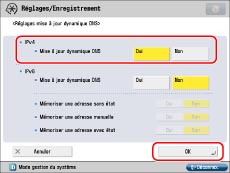 Appuyer sur [Réglages mise à jour dynamique DNS] pour [Réglages DNS] → effectuer les réglages suivants dans <IPv4> → appuyer sur [OK].