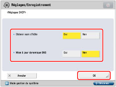 Si [DHCP] est défini sur "Oui" sous [Réglages adresse IP], configurer l'option DHCP. Si [DHCP] est défini sur "Non", continuer à l'étape 8.