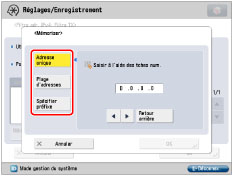 Pour spécifier une plage d'adresses IPv4 : Appuyer sur [Plage d'adresses] → appuyer sur [Première adresse] → saisir la première adresse IPv4 → appuyer sur [Dernière adresse] → définir la dernière adresse IPv4.