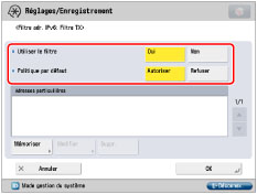 Si une tentative d'envoi ou de réception des données entre la machine et le périphérique dont l'adresse IPv6 ou le numéro de port doit être refusée, un journal d'éléments bloqués est créé. Pour afficher ce journal, voir "Vérification du journal d'éléments bloqués".