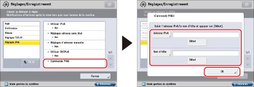 Appuyer sur [Commande PING] pour [Réglages IPv6] → effectuer les réglages suivants → appuyer sur [OK].