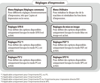 Les réglages d'impression sont configurés à l'aide des menus suivants.