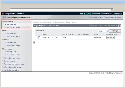 Pour afficher le journal des tâches d'impression locale, y compris les tâches de la boîte mémoire RX ou des boîtes fax confidentielles.