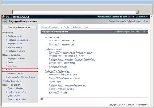 Cliquer sur [Réglages/Enregistrement] → sélectionner [Envoi] pour <Réglages de fonction>.