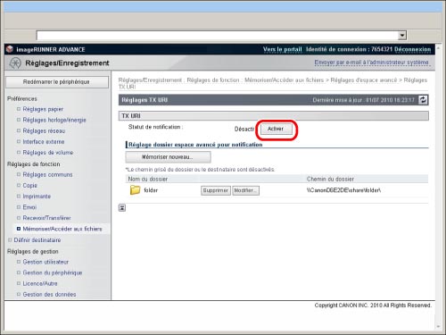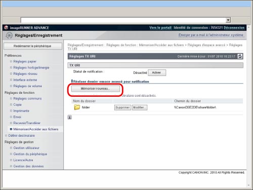 La notification est envoyée chaque fois qu'un fichier est enregistré dans le dossier spécifié dans l'espace avancé à partir de [Lire et mémoriser] sur l'afficheur tactile. En revanche, la notification n'est pas envoyée lorsqu'un fichier est enregistré dans un sous-dossier ou qu'un dossier y est ajouté.