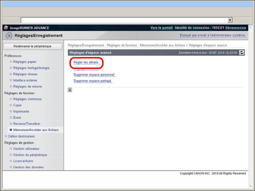Pour spécifier les réglages de l'espace avancé, il convient de se connecter en tant qu'administrateur.