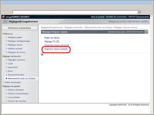 La suppression des différents dossiers de l'espace partagé n'est possible qu'à partir de l'interface utilisateur distante.