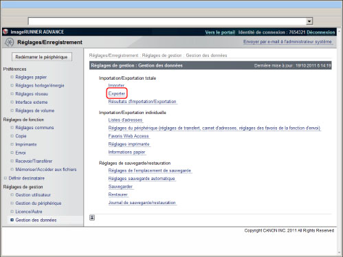 Il est également possible de vérifier les derniers résultats d'importation/exportation en appuyant sur [Gestion des données] sous <Réglages de gestion> → [Résultats d'Importation/Exportation].