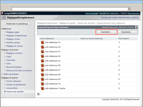 Si les réglages de périphérique sont importés, la liste d'adresses l'est également, ce qui entraîne la suppression des destinataires mémorisés et leur remplacement par les destinataires du fichier importé.
