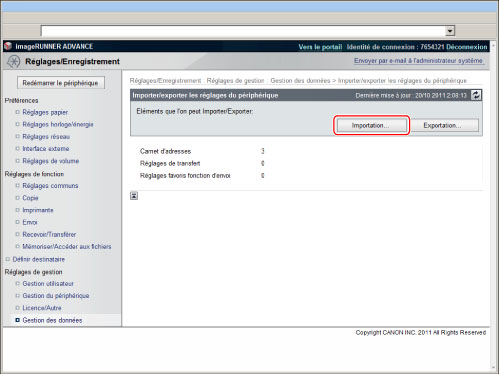 Si l'on importe une Liste d'adresses (Supprimer et remplacer) ou les réglages de transfert, les informations stockées sous [Réglages favoris] à partir du panneau de commande de la machine et la fonction Rappel sont supprimées.