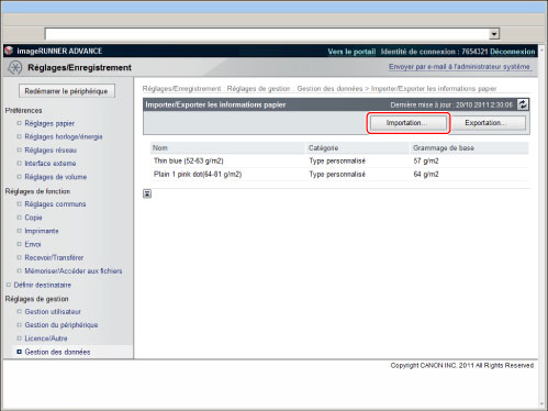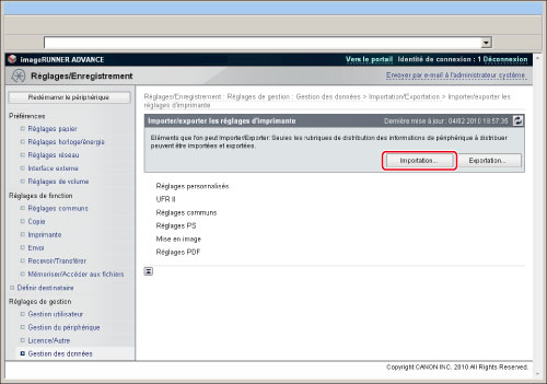 Si les données exportées de cette machine sont importées par des modèles autres qu'imageRUNNER ADVANCE 8205 PRO/8295 PRO/8285 PRO, les [Réglages favoris] du panneau de commande ne sont pas mis à jour.