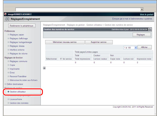 Les réglages de gestion des numéros de service sont identiques à ceux auxquels on peut accéder à partir du panneau de commande de la machine en appuyant sur [Gestion utilisateur] (Réglages/Enregistrement) → [Gestion des numéros de service]. Pour plus d'informations sur l'utilisation du panneau de commande afin de définir les réglages de gestion des numéros de service et pour en savoir plus sur la gestion des numéros de service, voir "Gestion des numéros de service".