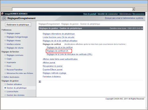 Cliquer sur [Réglages/Enregistrement] → [Gestion du périphérique] pour <Réglages de gestion>.