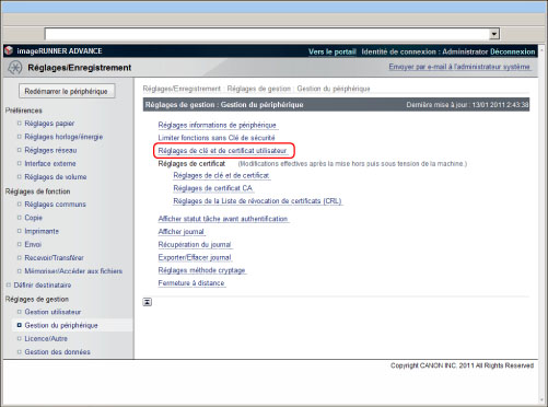 Cliquer sur [Réglages de clé et de certificat utilisateur].