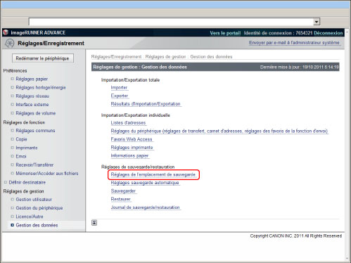 Pour sauvegarder/restaurer des données stockées, il convient de se connecter en tant qu'administrateur.