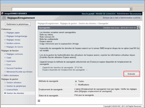 Les données sauvegardées à l'aide de cette fonction ne peuvent être restaurées que sur cette machine ou des mises à niveau du même modèle.
