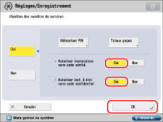 Les paramètres <Autoriser impressions sans code confid.> et <Autoriser lect. à dist. sans code confidentiel> ne sont activés que si la machine propose les fonctions d'impression et de lecture à distance.