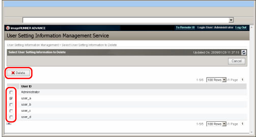 Sélectionner la méthode de suppression des informations de réglage utilisateur dans la page du service de gestion des informations de réglage utilisateur.