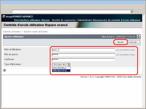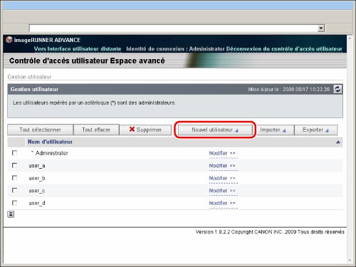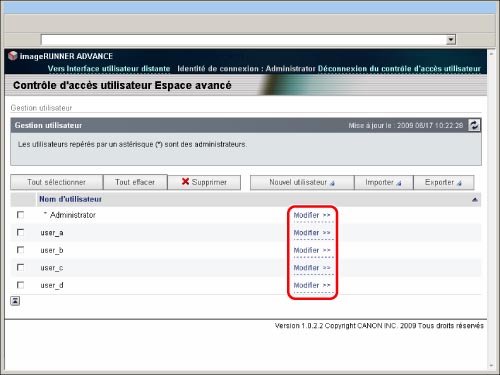 Seul l'administrateur de l'espace avancé peut mémoriser/modifier les informations utilisateur de la page [Gestion utilisateur] de [Contrôle d'accès utilisateur Espace avancé]. Les simples utilisateurs peuvent uniquement changer leur propre mot de passe. (Voir "Modification des informations utilisateur par les simples utilisateurs".)