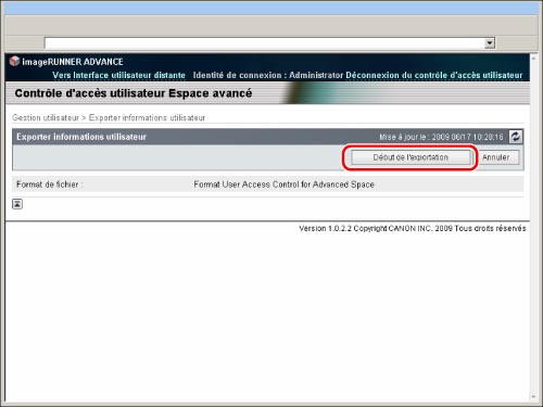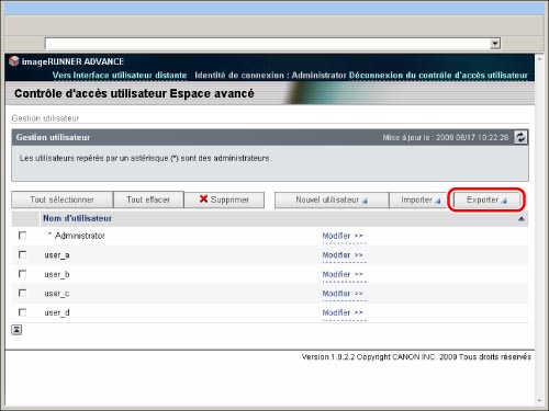 Exporter les informations utilisateur lors de la sauvegarde des données dans l'espace avancé afin de les utiliser sur une autre machine de la série imageRUNNER ADVANCE. Il est possible d'utiliser les données mémorisées dans l'espace avancé si l'on importe les informations utilisateur dans l'autre machine. Pour plus d'informations sur la sauvegarde/restauration des données mémorisées, voir "Sauvegarde des données stockées".