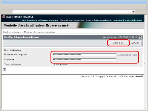 Entrer le nouveau mot de passe dans [Nouveau mot de passe] et [Confirmer] → cliquer sur [Mettre à jour].
