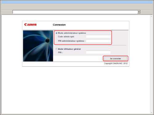Sélectionner [Mode administrateur système] → saisir <Code admin syst :> et <PIN administrateur système:> → cliquer sur [Se connecter].
