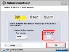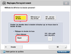 On peut utiliser des dossiers personnels sans spécifier les informations d'authentification pour chaque utilisateur si les conditions ci-dessous sont remplies. Dans ce cas, désélectionner [Util. infos auth. pour chq utilis.].